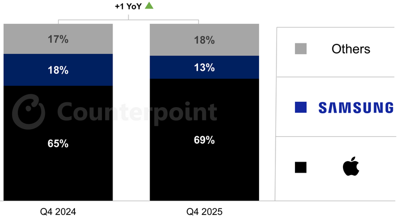 Apple вышла на рекордные показатели, увеличив свою долю до 69 % в IV квартале 2025 квартале с 65 % годом ранее. Производитель iPhone добился успеха за счёт падения продаж Samsung — доля корейского гиганта за тот же период сократилась с 18 % до 13 %. Рост продаж Apple обеспечила себе новейшими iPhone 16e и 17, которые выступили в среднем и премиальном сегменте; компания заручилась маркетинговой поддержкой операторов AT&T, T-Mobile и Verizon, причём долю в 89 % из всех трёх занял AT&T; самой популярной моделью у операторов оказалась топовая iPhone 17 Pro Max.