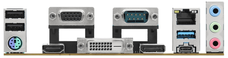 Разводка разъёмов ввода/вывода также ясно указывает на то, что эта плата предназначена для бизнес-применения и встраиваемых систем. Набор включает устаревшие порты D-Sub (аналоговый выход для дисплея) и DVI-D, а также HDMI и DisplayPort. На задней панели также имеется последовательный COM-порт. На самой плате есть внутренний разъём COM, порт для печати (параллельный), eDP, разъём датчика вскрытия корпуса и SPI TPM, подходящий для POS-терминалов, киосков и других встраиваемых ПК.
