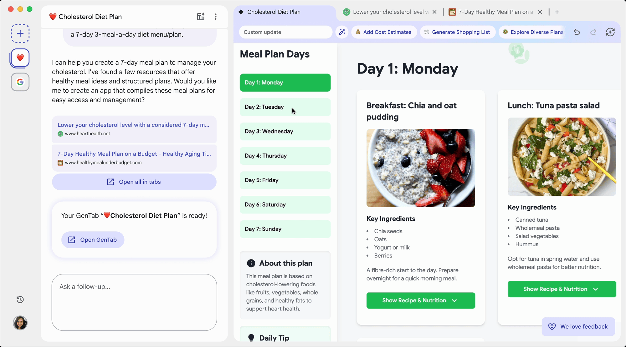 Например, при изучении определённой темы GenTabs может предложить сгенерировать веб-приложение для визуализации информации. Например, если попросить бота помочь спланировать путешествие, он может создать полноценное мини-приложение с картой с точками интереса, простым построителем маршрутов, ссылками на источники и данные, собранные с открытых вкладок. В более простом сценарии инструмент способен помочь составить план питания на основе подборки онлайн-рецептов.