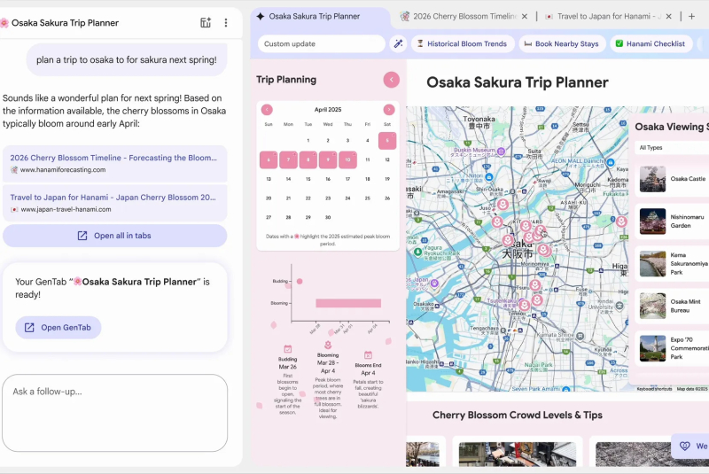 Например, при изучении определённой темы GenTabs может предложить сгенерировать веб-приложение для визуализации информации. Например, если попросить бота помочь спланировать путешествие, он может создать полноценное мини-приложение с картой с точками интереса, простым построителем маршрутов, ссылками на источники и данные, собранные с открытых вкладок. В более простом сценарии инструмент способен помочь составить план питания на основе подборки онлайн-рецептов.