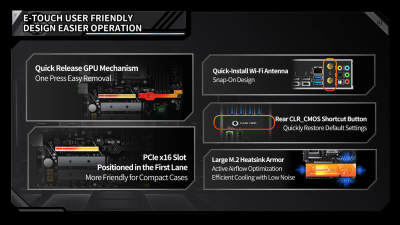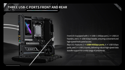 У MS-iCraft X870M также имеется один слот PCIe 5.0 x16, три разъёма M.2 для NVMe-накопителей PCIe 5.0, поддержка Wi-Fi 7, 5-гигабитный сетевой контроллер, а также пара USB-C для фронтальной и тыльной панелей и пара USB4 (Type-C 40 Гбит/с). MaxSun также установила на кожух разъёмов задней панели цифровой дисплей, отображающий различную информацию о системе, и добавила на радиатор чипсета активный вентилятор для более эффективного охлаждения. Для удобства плата предлагает механизм для упрощённого демонтажа видеокарты и кнопку сброса BIOS. Также есть индикатор POST-кодов. С остальными особенностями материнской платы можно ознакомиться в галерее ниже.