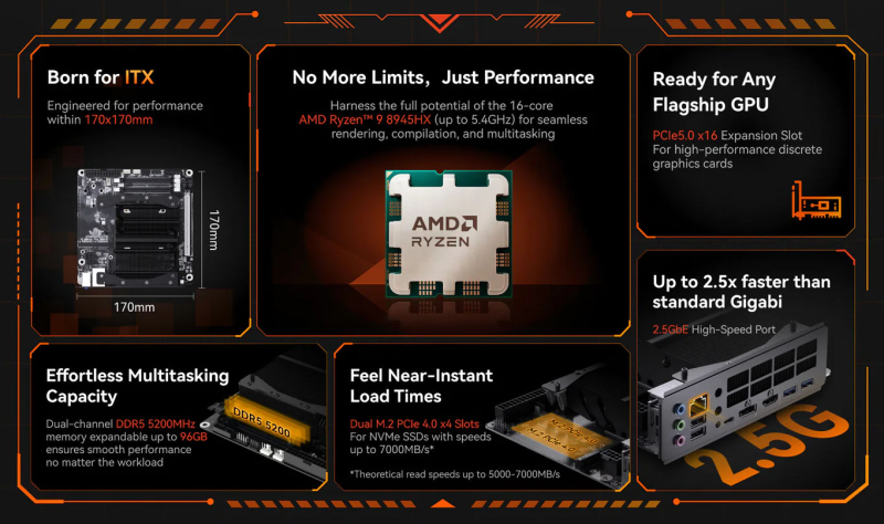 Компания Minisforum выпустила новую платформу BD895i SE MoDT на базе встроенного мобильного 16-ядерного и 32-поточного процессора AMD Ryzen 9 8945HX с частотой до 5,4 ГГц, предназначенную для построения компактного ПК формата Mini-ITX. Чип в составе платформы относится к серии Dragon Range Refresh, представленной в январе этого года на замену серии процессоров Ryzen 7000HX, предназначенных в основном для игровых ноутбуков.