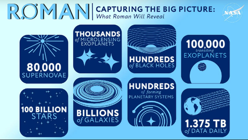 Обзор High-Latitude Time-Domain Survey поможет уточнить природу тёмной энергии посредством измерений сверхновых и слабого гравитационного линзирования. Обзор Galactic Bulge Time-Domain Survey с помощью микролинзирования обнаружит десятки тысяч транзитных экзопланет, включая «планеты-изгои» и объекты в обитаемой зоне далёких звёзд, а также изолированные чёрные дыры.