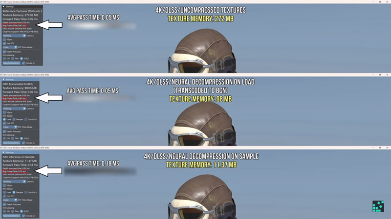 Например, в демонстрационном ролике исходный объём текстуры шлема составлял 272 Мбайт. После блочного сжатия он сократился до 98 Мбайт. Применение NTC позволило уменьшить его до 11,37 Мбайт без потери качества — это более чем в 24 раза меньше по сравнению с оригиналом. Аналогичные результаты были продемонстрированы на видеокарте Intel с моделью тираннозавра: после декодирования текстуры с помощью NTC они выглядели чётче и ближе к оригиналу, чем при стандартном сжатии.