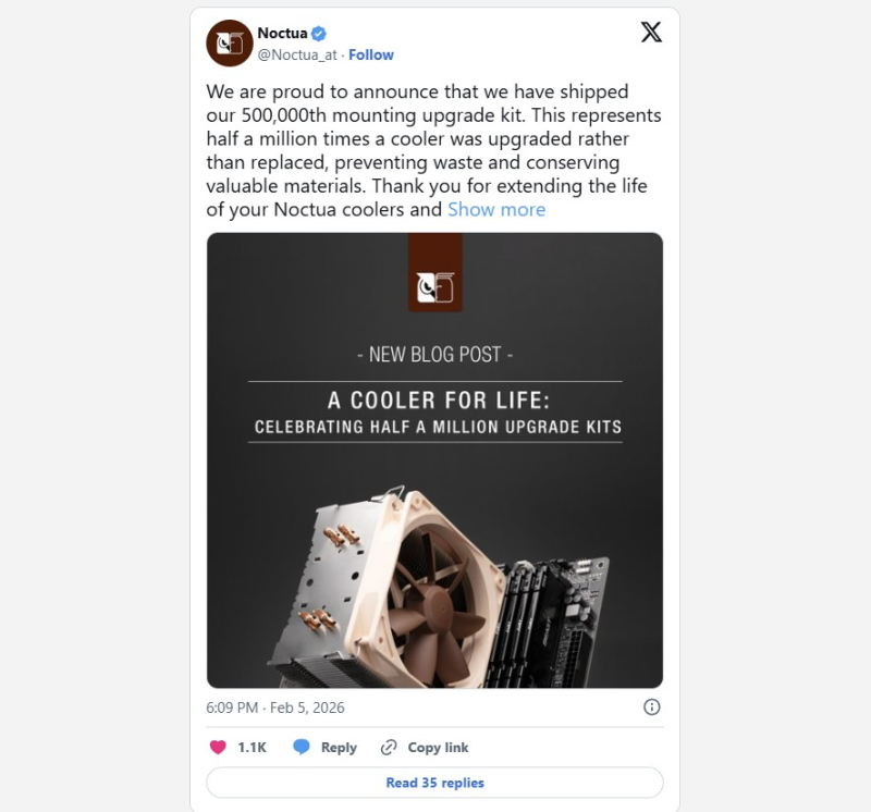 Noctua рассказала, что её клиент из Финляндии запросил монтажный комплект под AMD Socket AM5 для своего кулера Noctua NH-U12P, и производитель системы охлаждения его предоставил. С момента покупки кулера до обновления прошло 17 лет. В Noctua заявляют, что этот случай выделяется длительностью интервала между покупкой кулера и первым обновлением крепежа. Заодно Noctua отметила более масштабное событие: она отгрузила по всему миру 500 тыс. монтажных комплектов для обновления кулеров.