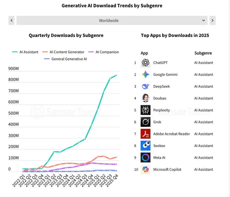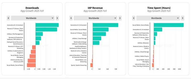 Генеративный искусственный интеллект, ставший определяющим трендом последнего года, продемонстрировал лидирующий рост доходов: выручка от внутриигровых покупок в этой категории увеличилась более чем в три раза, превысив $5 млрд в 2025 году. Количество загрузок приложений с ИИ также выросло, удвоившись по сравнению с прошлым годом и достигнув 3,8 млрд.