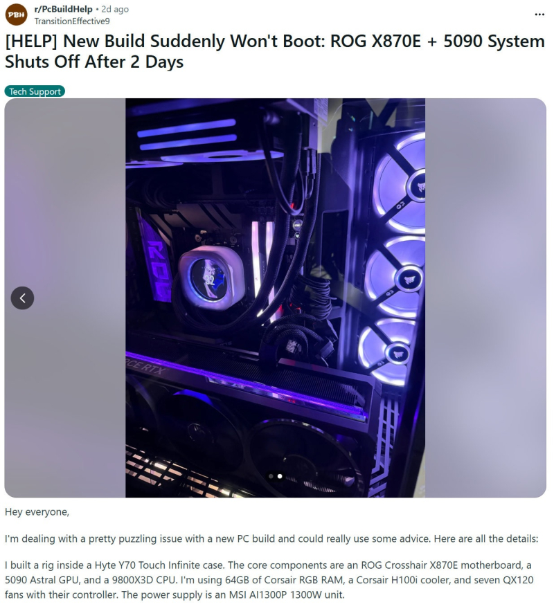 - Материнская плата ROG Crosshair X870E Hero. Система зависла в процессе игровой сессии, после чего появился чёрный экран с ошибкой. Автор отмечает, что проблему решила замена процессора и он продолжает выяснять причины сбоя с поддержкой AMD.