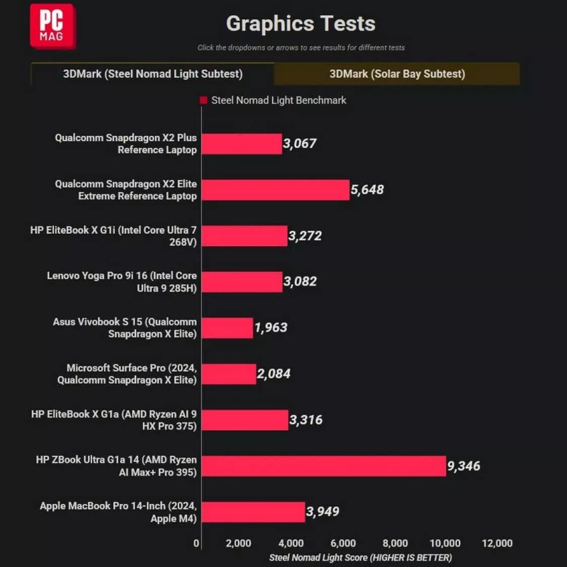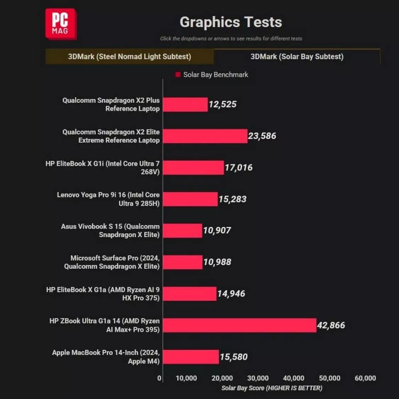 Журнал PC Magazine также провёл тестирование интегрированной графики чипа. В бенчмарке 3DMark Steel Nomad Light она уступила всем конкурентам. В тесте 3DMark Solar Bay процессор Snapdragon X2 Plus также показал более низкие результаты, чем чипы Intel, AMD и Apple.