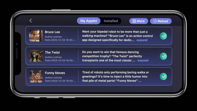 В основе платформы, как поясняет издание Humanoids Daily, лежит библиотека действий (Action Library), в которую сторонние разработчики могут загружать собственные наборы движений, записанные и обученные на роботах Unitree. Другие пользователи могут находить эти наборы в каталоге и устанавливать их одним кликом. После загрузки через веб-интерфейс действия автоматически синхронизируются с мобильным приложением владельца робота и отображаются во вкладке Applet Library.
