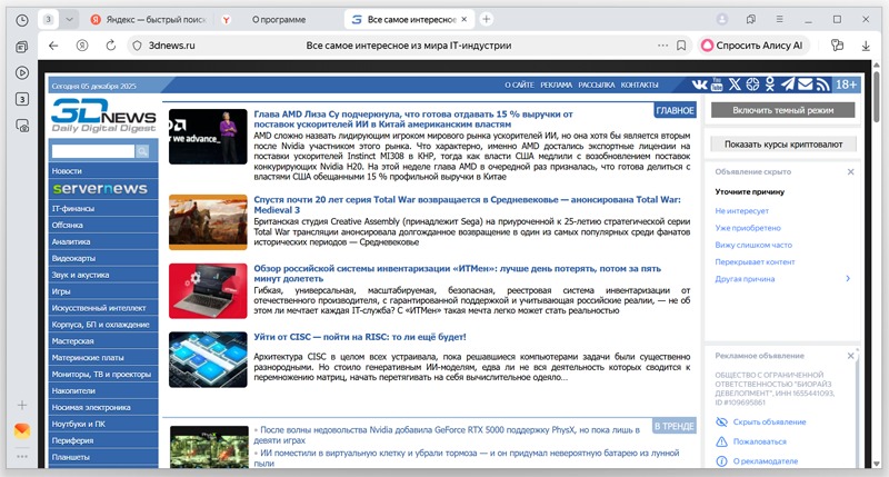 «Яндекс Браузер» теперь будет потреблять меньше оперативной памяти благодаря ИИ-оптимизации