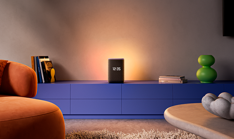 Светодиоды на задней стороне корпуса мягко подсвечивает стену, создавая атмосферный фон. Такое эмбиент-освещение можно использовать в роли ночника с имитацией пламени свечи, декоративной лавовой лампы, цветомузыки или просто для спокойной подсветки помещения вечером. Оттенки можно детально настраивать — устройство отображает до 16 млн цветов. Дополняет визуальный образ и фирменная круговая светодиодная полоса в верхней части корпуса, которая отображает статусы «Алисы» и другие системные сигналы.